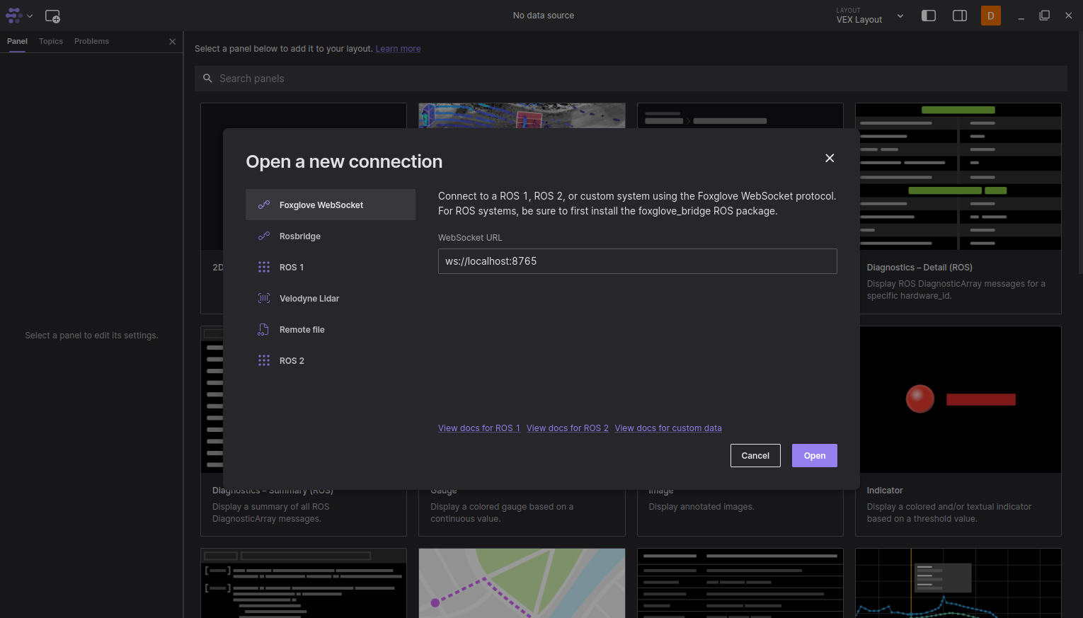Launch Foxglove and open a websocket connection.