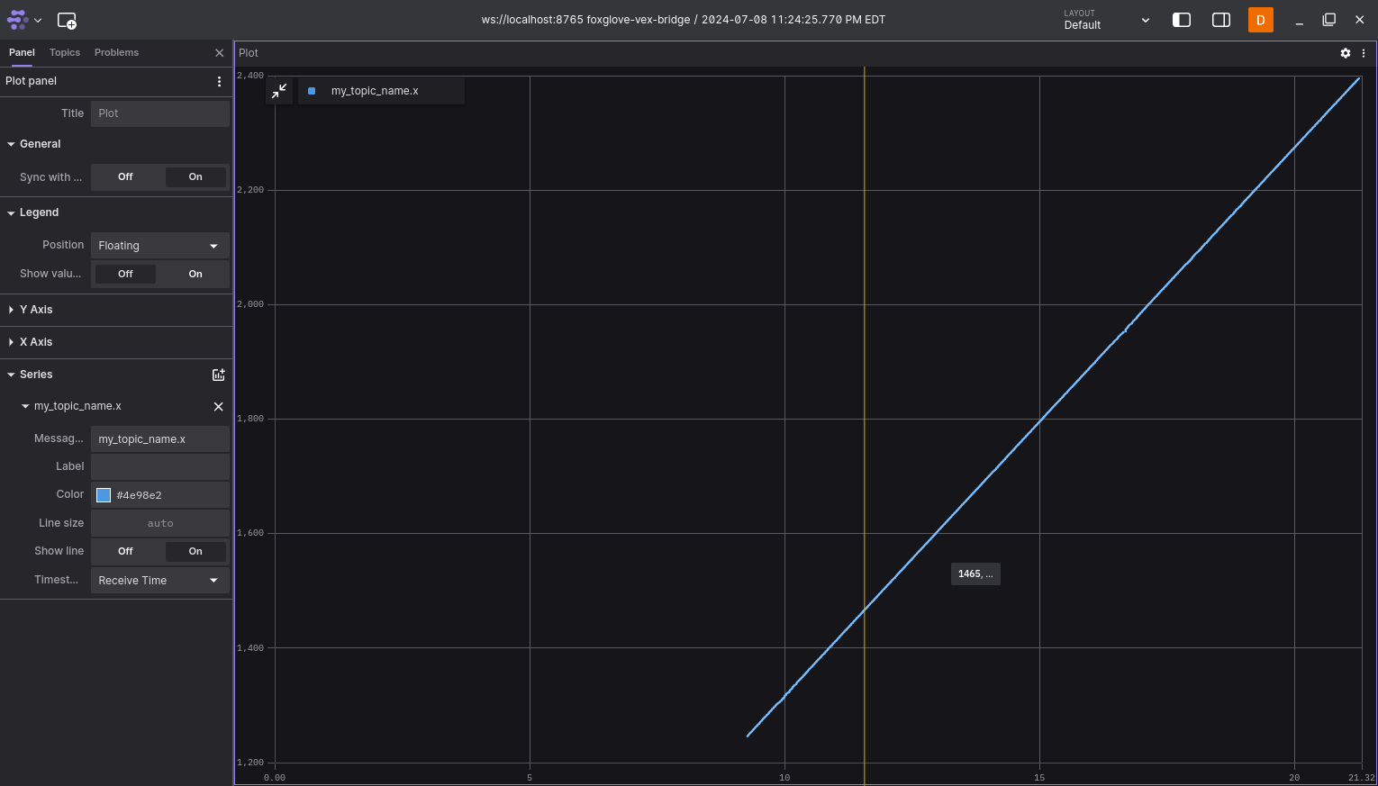 To start sending messages, run your robot's program. In Foxglove, add a plot panel to your layout and add a series with a message path of my_topic_name.x, you should see the x value being plotted over time.